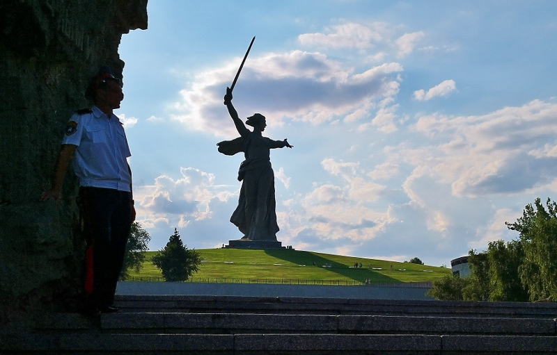 Die Gedenkstätte Mamajew ist der Schlacht von Stalingrad, die die Wende im 2. Weltkrieg einläutete und den ca. 700.000 Toten gewidmet. Beherrscht wird die Gedenkstätte von der 86 m hohen Skulptur „Mutter Heimat“, zu deren Füßen 34.505 sowjetische Soldaten begraben liegen. In der Ruhmeshalle, in der Soldaten die Ehrenwache halten, findet gerade eine Wachablösung statt.