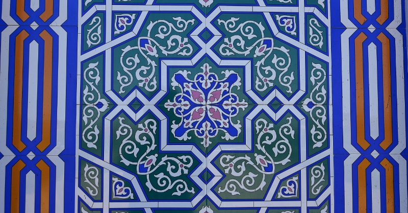 Wir mit Kopf, der arme Korkhyt Ata ohne Kyzylorda zeichnet sich zunächst durch großzügige und nett bepflanzte Straßen aus. Die Moschee ist unser 1. Anlaufpunkt. Der Imam kommt sofort auf uns zugelaufen und bittet uns in seine Moschee. Es ist auch kein Problem, dass ich mein Kopftuch vergessen habe. Stolz führt er uns in den verschiedenen Räumen herum. Schön ist sie, diese Moschee, die Teppiche sind neu und dick und flauschig und alles ist in blau/türkis-Tönen gehalten mit goldenen und weißen Momenten.