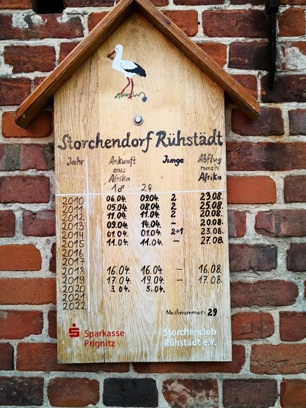 Dann zieht es uns weiter zum Storchendorf Rühstädt. In dem kleinen Ort brüten aktuell 38 Storchenpaare. Wir lassen uns vom NABU eine Karte mit einem Dorfrundgang geben, bei dem wir sämtliche Storchenpaare beobachten können.