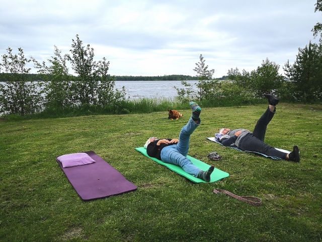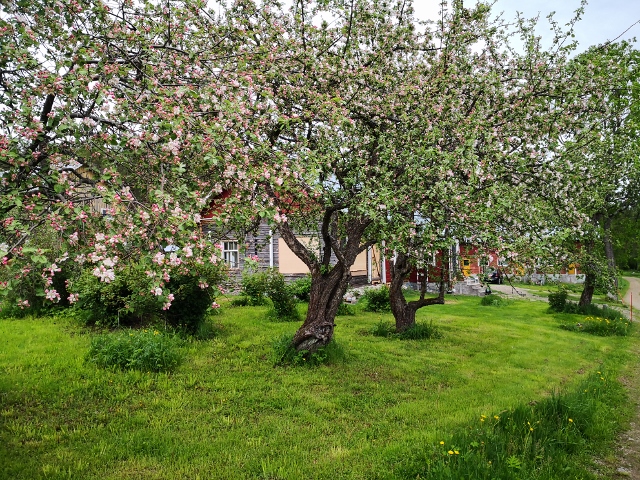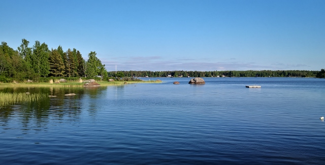 Der Tag beginnt mit gemeinsamer Morgengymnastik. Wir trennen uns nur schwer von diesem schönen Platz, doch das nächste Ziel ist nicht weit – die Insel Björkö. Zunächst peilen wir einen Platz bei dem Hafen Svedjehamn an, doch der gefällt uns nicht. Bauarbeiten und etliche Touristen vertreiben uns. Der kleine Björköby Fiskehamn, nur 5 km entfernt, sagt uns jedoch sofort zu. Der Hafenmeister nickt zustimmend, als wir um Erlaubnis fragen, hier eine Nacht zu stehen und wir verbringen hier einen relaxten Tag. Am Nachmittag machen wir eine kleine Fahrradtour auf der Insel. Es wirkt hier alles so friedlich, die Sonne scheint und auf den Wiesen blühen üppig die Wildblumen. Wir besichtigen eine kleine Holzkirche am Wegesrand und versorgen uns in einem kleinen Landkonsum, der ein erstaunlich umfangreiches Sortiment hat, mit allem Nötigen. Wieder zu Hause kocht uns Irmhild eine leckere Nudelsoße und wir stoßen auf Tobis Geburtstag mit einer leckeren Flasche Rotwein an!